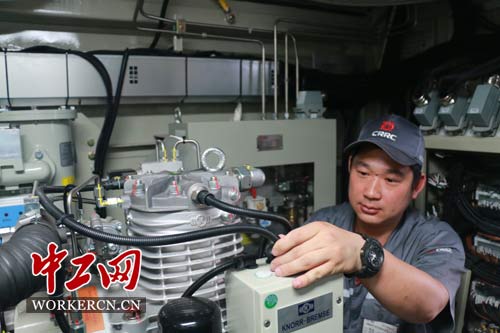 張如意在調(diào)試“和諧號”空氣壓縮機。中工網(wǎng)記者 葛文琦攝