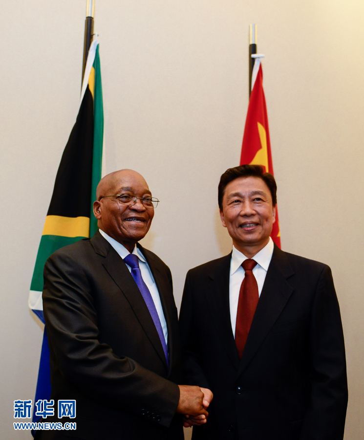 11月22日,南非共和國(guó)總統(tǒng)、非洲人國(guó)民大會(huì)主席雅各布·祖馬(左)在開(kāi)普敦會(huì)見(jiàn)應(yīng)邀訪(fǎng)問(wèn)的中國(guó)國(guó)家副主席李源潮。 新華社記者翟健嵐攝