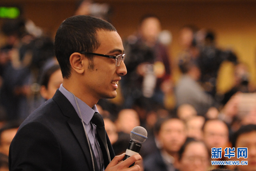 十二屆全國人大四次會議新聞中心于3月8日(星期二)10時在梅地亞中心多功能廳舉行記者會,邀請外交部部長王毅就“中國的外交政策和對外關(guān)系”的相關(guān)問題回答中外記者的提問。圖為埃及七日報記者提問。新華網(wǎng)/中國政府網(wǎng)記者 陳杰 攝