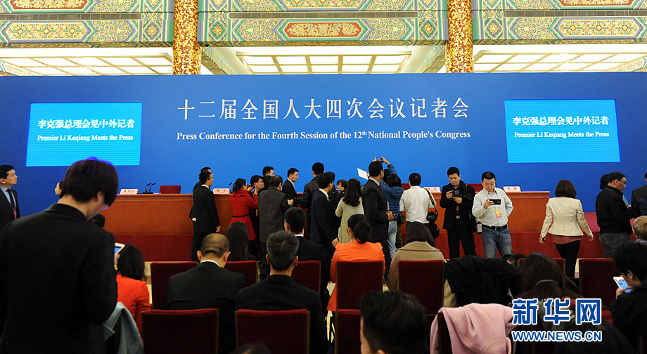 3月16日上午,國務(wù)院總理李克強在人民大會堂三樓金色大廳會見采訪十二屆全國人大四次會議的中外記者并回答記者提出的問題。圖為記者會現(xiàn)場。距記者會開始還有一段時間,現(xiàn)場已經(jīng)人頭攢動。新華網(wǎng)/中國政府網(wǎng) 陳競超 攝