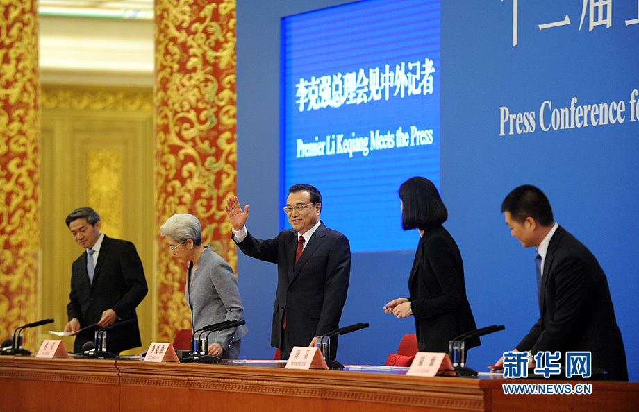 3月16日上午,國務院總理李克強在人民大會堂三樓金色大廳會見采訪十二屆全國人大四次會議的中外記者并回答記者提出的問題。圖為:步入會場后,李克強總理與記者打招呼。新華網(wǎng)/中國政府網(wǎng) 陳競超 攝
