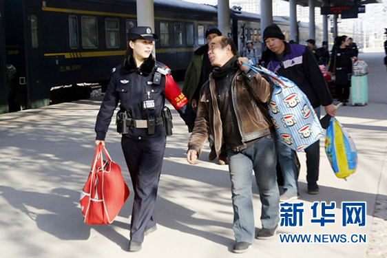 2月12日,侯馬站派出所民警為進出站旅客提供幫助。 新華網(wǎng) 田明 攝