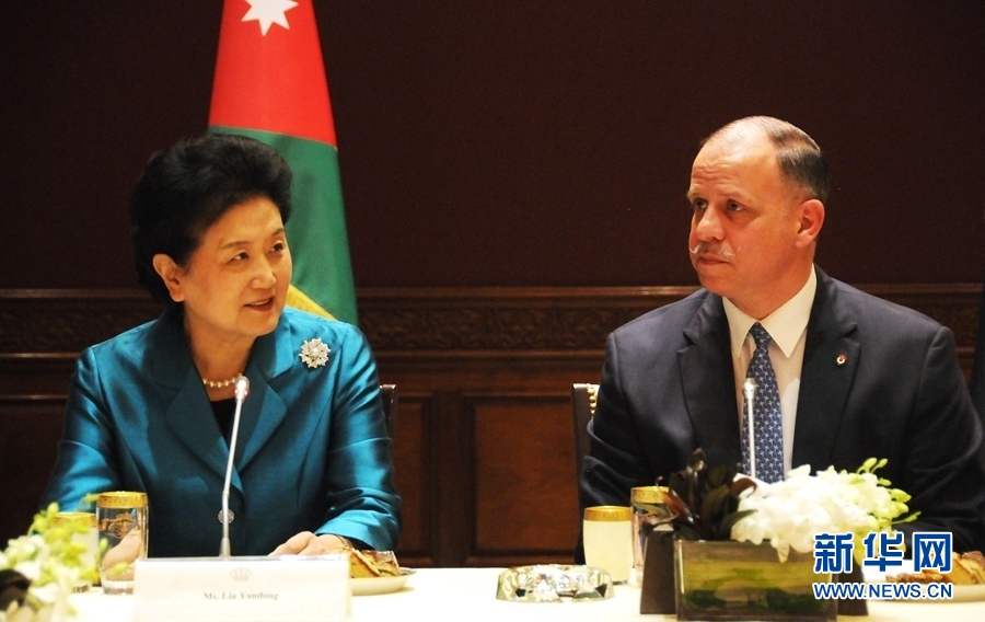 4月20日,在約旦首都安曼,約旦代國王費(fèi)薩爾(右)會(huì)見中國國務(wù)院副總理劉延?xùn)|。新華社記者林曉蔚攝