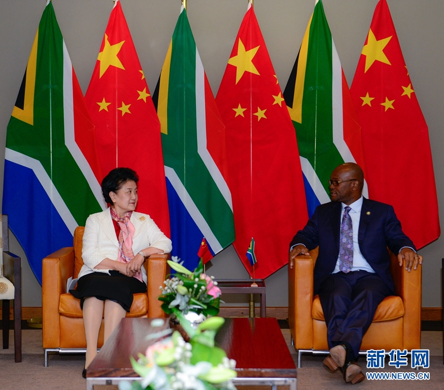 4月24日,中國國務院副總理劉延東(左)在南非比勒陀利亞會見南非藝術和文化部部長、中南高級別人文交流機制南方委員會主席姆特特瓦。新華社記者翟健嵐攝