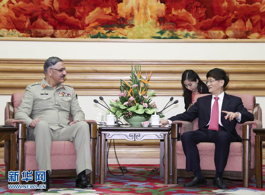 6月16日,中共中央政治局委員、中央政法委書記孟建柱在北京中南海會(huì)見(jiàn)巴基斯坦參謀長(zhǎng)聯(lián)席會(huì)議主席祖拜爾。 新華社記者 丁林 攝