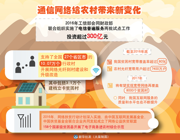 近年來,我國加大對中西部地區(qū)和農(nóng)村貧困地區(qū)移動互聯(lián)網(wǎng)基礎(chǔ)設(shè)施建設(shè)的投資力度,加快推進(jìn)貧困地區(qū)網(wǎng)絡(luò)全覆蓋,著力降低貧困群眾享受信息生活門檻。截至2016年底,我國貧困村寬帶覆蓋率超過80%,農(nóng)村光纖寬帶用戶超過7400萬戶。今年將有望實現(xiàn)寬帶網(wǎng)絡(luò)再覆蓋8000個貧困村。同時,我國互聯(lián)網(wǎng)服務(wù)的質(zhì)量和水平也在不斷提升。