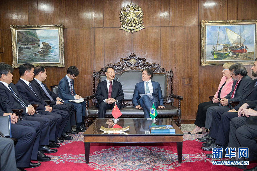 7月11日,在巴西首都巴西利亞,中共中央書記處書記、全國(guó)政協(xié)副主席杜青林(中左)會(huì)見(jiàn)巴西參議院議長(zhǎng)歐尼西奧·奧利維拉(中右)。新華社記者李明攝