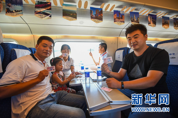 8月3日,在呼和浩特東站開往烏蘭察布的列車上,乘客們?cè)谡故炯由w紀(jì)念印章的車票。新華社記者 連振 攝