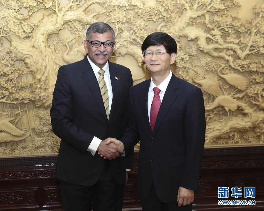 8月22日,中共中央政治局委員、中央政法委書(shū)記孟建柱在北京會(huì)見(jiàn)新加坡首席大法官梅達(dá)順。 新華社記者 龐興雷 攝