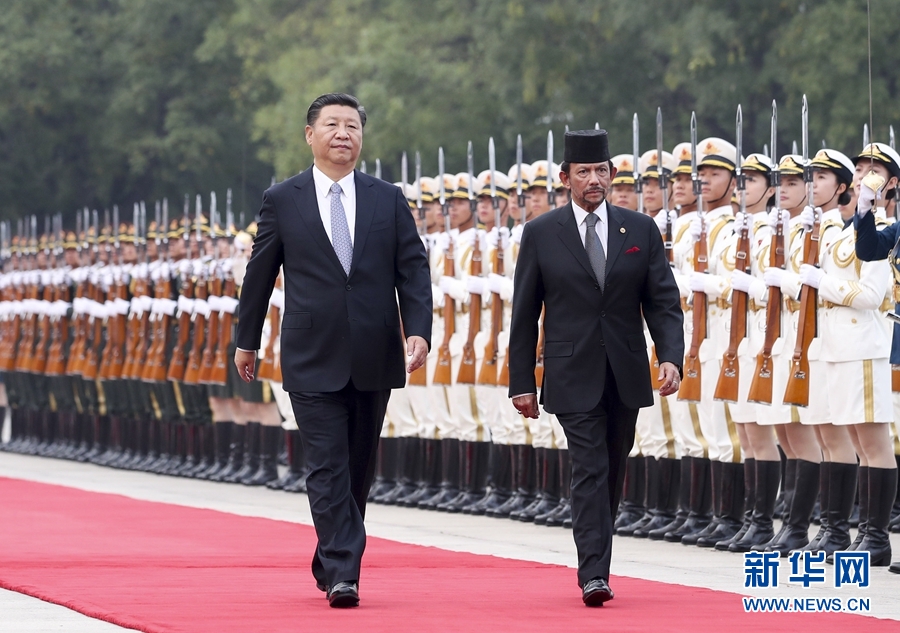 9月13日,國家主席習近平在北京人民大會堂同文萊蘇丹哈桑納爾舉行會談。這是會談前,習近平在人民大會堂東門外廣場為哈桑納爾舉行歡迎儀式。新華社記者 謝環(huán)馳 攝
