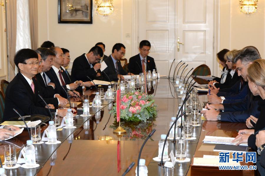 9月12日,克羅地亞總理普連科維奇(右二)在首都薩格勒布會見到訪的習(xí)近平主席特使、中共中央政治局委員、中央政法委書記孟建柱(左一)。新華社記者高磊攝
