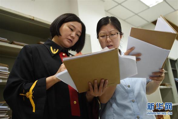 9月28日,北京市朝陽(yáng)區(qū)人民法院奧運(yùn)村人民法庭庭長(zhǎng)劉黎(左)在開(kāi)庭結(jié)束后與同事討論一起案件。新華社記者 鞠煥宗 攝