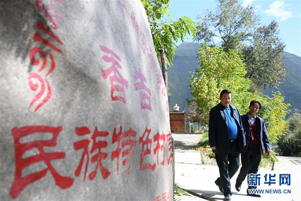 10月12日,甘肅甘南藏族自治州夏河縣曲奧鄉(xiāng)香告村村支書鬧日加(左)和村民邊走邊談。新華社記者 陳斌 攝
