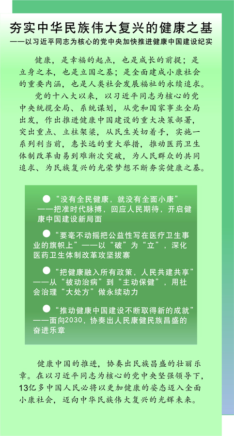 健康,是幸福的起點,也是成長的前提;是立身之本,也是立國之基;是全面建成小康社會的重要內(nèi)涵,也是人類社會發(fā)展福祉的永續(xù)追求。