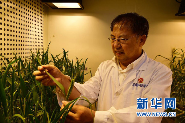 在河南科技學院小麥研究中心,小麥育種專家茹振鋼在人工氣候?qū)嶒炇也榭葱←滈L勢(9月30日攝)。新華社記者馮大鵬攝
