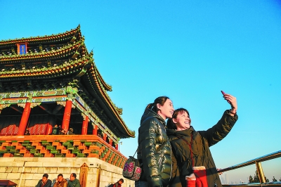 昨天天氣晴朗,在景山萬春亭,游客飽覽京城風(fēng)景,愉快留影。實(shí)習(xí)記者 武亦彬攝