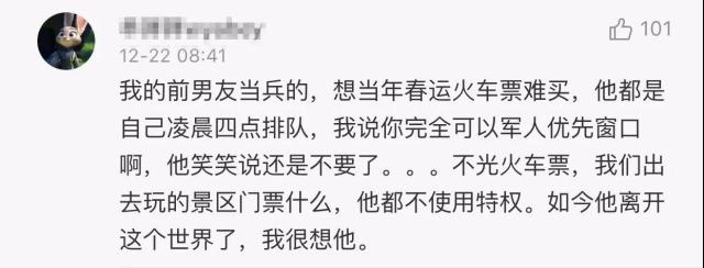 @宇:我去年夏天在蘭州站親眼看見(jiàn)一位被召回的軍官著急買票歸隊(duì),被排隊(duì)的人罵沒(méi)素質(zhì),售票人員也不給優(yōu)先。最后我就讓他排我前面了。他們?yōu)閲?guó)家人民付出太多,愛(ài)護(hù)軍人,才是愛(ài)護(hù)自己。