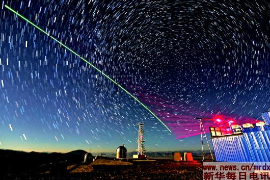▲“墨子號(hào)”量子科學(xué)實(shí)驗(yàn)衛(wèi)星與阿里量子隱形傳態(tài)實(shí)驗(yàn)平臺(tái)建立天地鏈路(合成照片,2016年12月9日攝)。新華社記者金立旺攝
