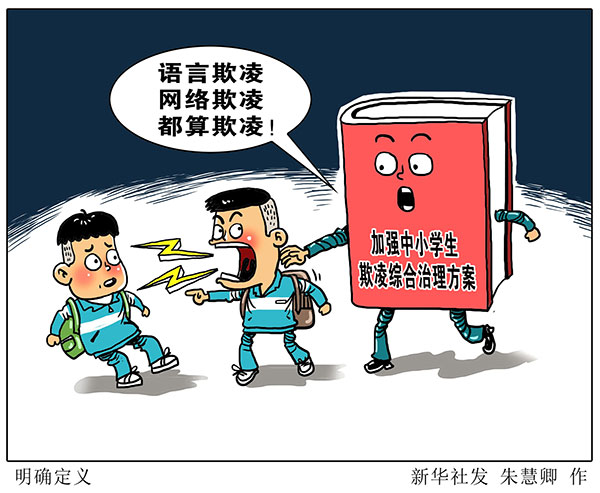 教育部教育督導(dǎo)局局長(zhǎng)、國(guó)務(wù)院教育督導(dǎo)委員會(huì)辦公室主任何秀超介紹,在11部門聯(lián)合印發(fā)的方案中,首次對(duì)學(xué)生欺凌作出明確界定,指出中小學(xué)生欺凌是發(fā)生在校園內(nèi)外、學(xué)生之間,一方單次或多次蓄意或惡意通過肢體、語言及網(wǎng)絡(luò)等手段實(shí)施欺負(fù)、侮辱,造成另一方身體傷害、財(cái)產(chǎn)損失或精神損害等的事件。
