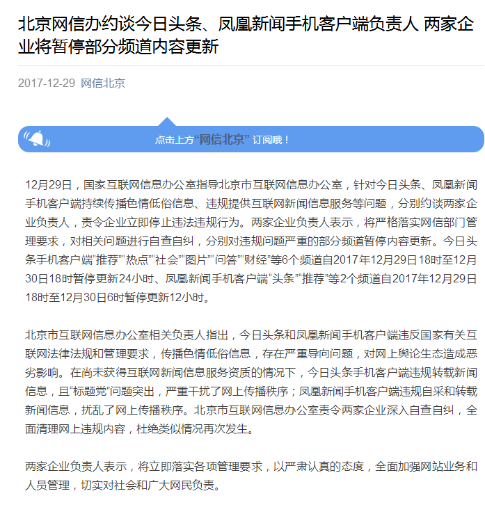 原標(biāo)題:北京網(wǎng)信辦約談今日頭條、鳳凰新聞手機客戶端負(fù)責(zé)人 兩家企業(yè)將暫停部分頻道內(nèi)容更新