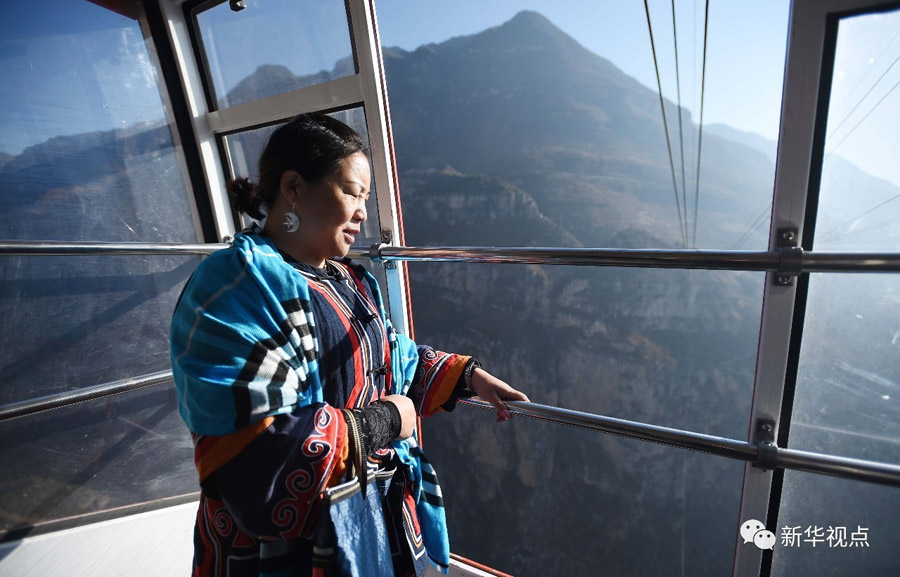 2017年2月16日,身為村黨支部書記的駱云蓮乘坐新修建的索道纜車去古路村六組調(diào)研。