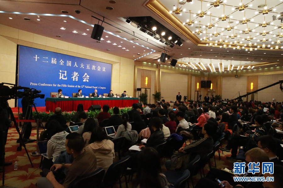 3月14日,十二屆全國人大五次會議新聞中心舉行記者會,邀請國家質檢總局局長支樹平、副局長兼國家認證認可監(jiān)督管理委員會主任孫大偉、國家標準化管理委員會主任田世宏就“質量提升”的相關問題回答中外記者的提問。圖為記者會現場。新華網/中國政府網 傅義洲 攝