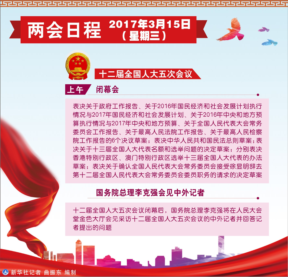 圖表:3月15日兩會(huì)日程 新華社記者 曲振東 編制