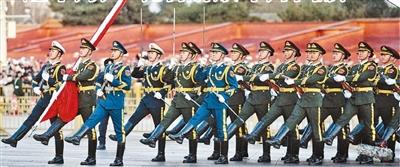 7時33分,編隊走出金水橋,齊步換正步行進。3名分隊長拔刀出鞘,行舉刀禮。同一時間,90名隊員由肩槍換為端槍,威武前行。