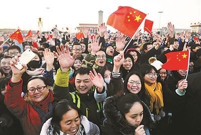 “起來,不愿做奴隸的人們……”迎著新年的第一縷晨曦,五星紅旗冉冉升起,全場高唱國歌。46秒后,國旗升至桿頂,飄揚在祖國的藍天,現(xiàn)場氣氛愈加熱烈,人群中爆發(fā)出如潮的掌聲、歡呼聲。