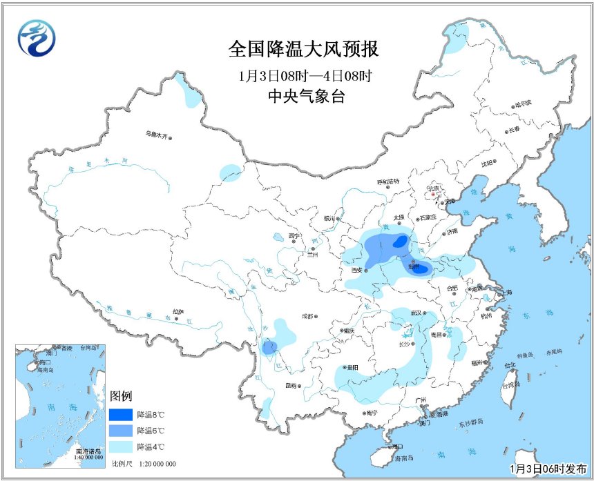 張濤:氣象監(jiān)測顯示,2日11時至3日11時,甘肅南部、寧夏中南部、陜西中部、河南中部、湖北西北部出現(xiàn)小雪,局地出現(xiàn)3~4毫米的中雪,積雪深度達(dá)2~4厘米。江蘇、安徽、湖北東部、湖南、貴州等地出現(xiàn)小到中雨,云南西部和南部出現(xiàn)中到大雨。
