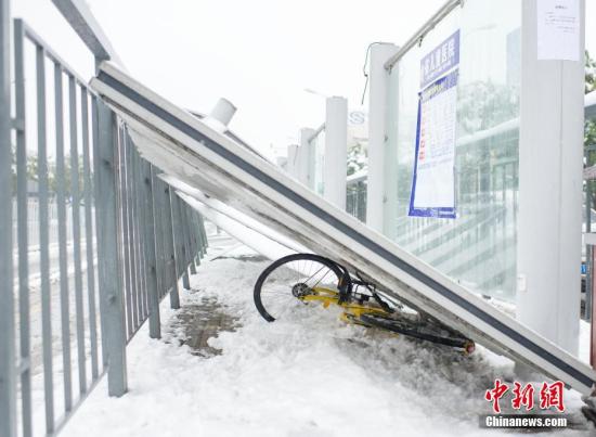 1月4日,安徽合肥望江路衛(wèi)崗公交站臺被雪壓倒。合肥市公交集團在公交站臺貼出告示:“公交站臺存在安全隱患,請到路邊候車”。 中新社記者 張婭子 攝
