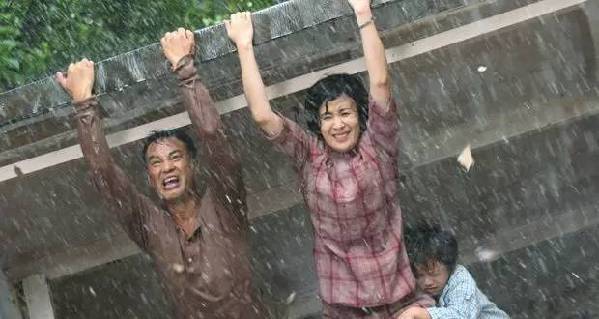 羅先生(任達(dá)華飾)羅太太(吳君如飾)用身體撐起頂棚?!稓q月神偷》劇照