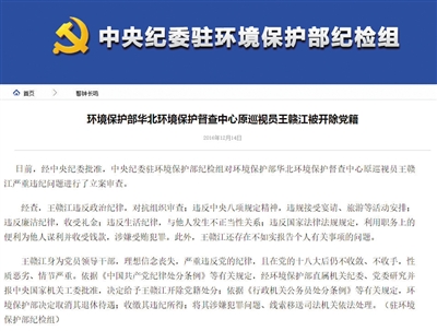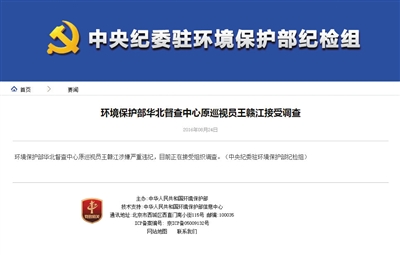2016年8月24日,中央紀委駐環(huán)境保護部紀檢組發(fā)布消息,環(huán)境保護部華北督查中心原巡視員王贛江涉嫌嚴重違紀,接受組織調(diào)查。