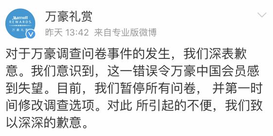 對于萬豪禮賞會員調(diào)查問卷的錯誤,我們深表歉意。在發(fā)現(xiàn)錯誤后,所有問卷調(diào)查已經(jīng)被立即終止。