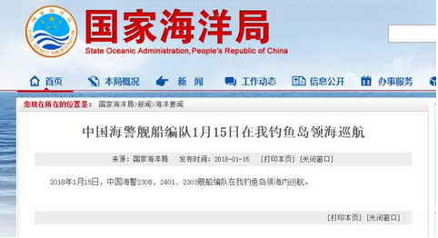 據(jù)國(guó)家海洋局網(wǎng)站消息,2017年12月30日,中國(guó)海警2306、2502、2106艦船編隊(duì)在中國(guó)釣魚島領(lǐng)海內(nèi)巡航。2017-12-30 10:09:23