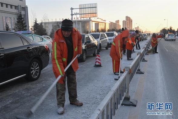 1月23日,在黑龍江省牡丹江市西安區(qū),環(huán)衛(wèi)工們完成晨掃,帽子上結(jié)著霜花。新華社發(fā)(張春祥 攝)