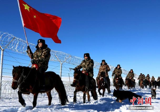 12月30日,駐守在祖國西北邊陲的武警新疆阿勒泰邊防支隊托普鐵熱克邊防派出所官兵,在中哈邊境一線的雪原上巡邏踏查。王友波 攝