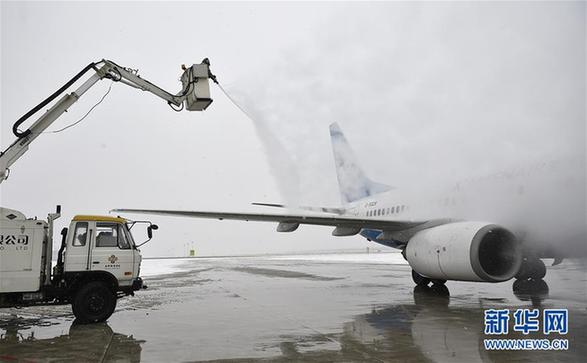 1月4日,銀川河?xùn)|國際機(jī)場機(jī)務(wù)人員對飛機(jī)進(jìn)行除冰作業(yè)。新華社記者 王鵬 攝
