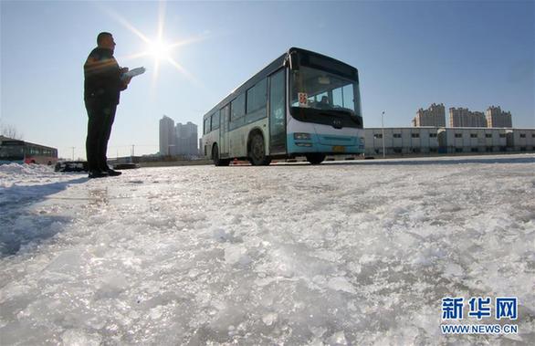 1月12日,在山東煙臺孫家灘公交場站,工作人員考核駕駛員冰雪路面駕駛技能。新華社發(fā)(唐克 攝)