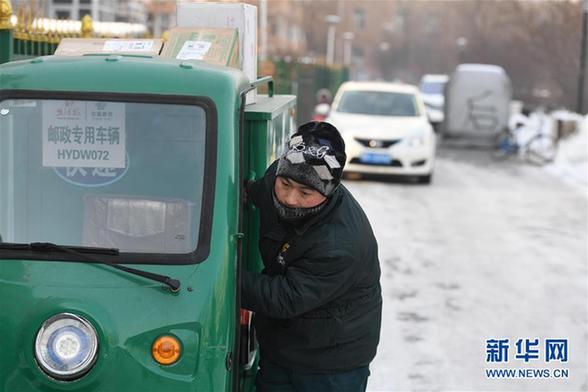 1月23日,“冰城”哈爾濱市最低氣溫為零下35攝氏度,投遞員于明寶冒著嚴(yán)寒,像往常一樣為客戶投遞郵件。新華社記者 王松攝