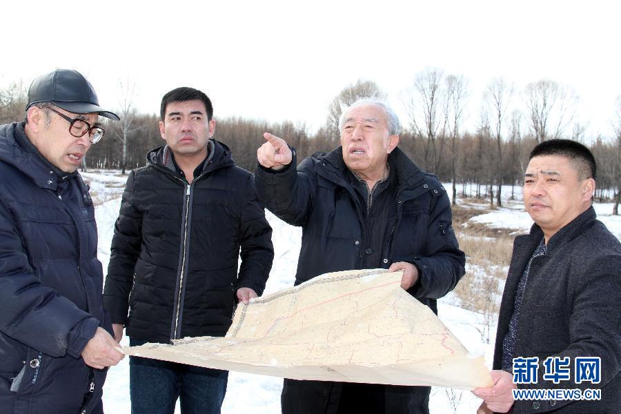 2016年3月14日,王樹清(右二)在黑龍江省拜泉縣國富鎮(zhèn)通肯村和當(dāng)?shù)馗刹恳?guī)劃植樹造林。新華社發(fā)