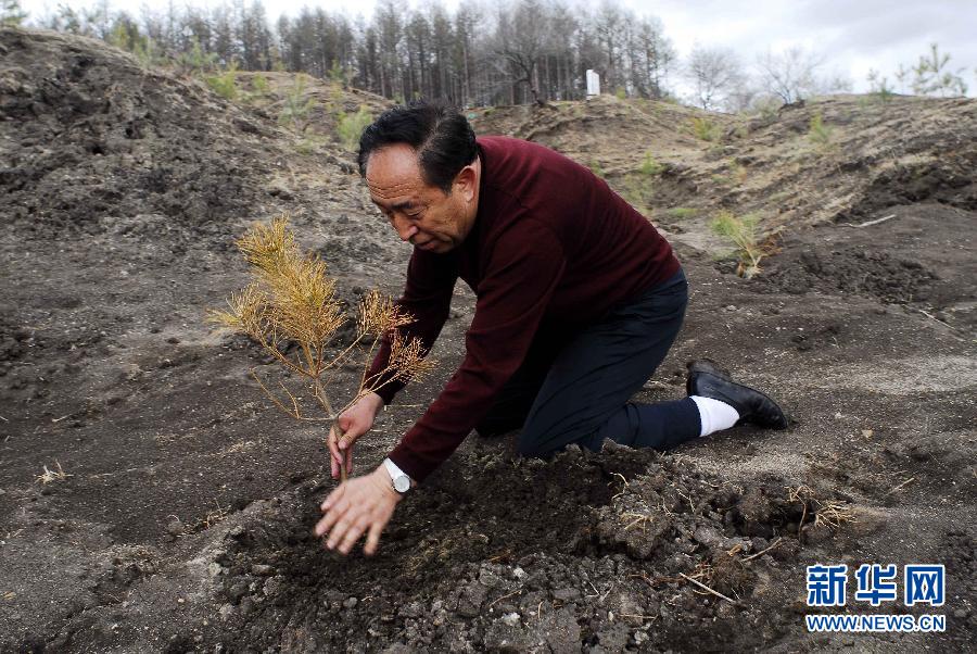2006年5月1日,在黑龍江省齊齊哈爾市拜泉縣,王樹清在檢查小樹苗。新華社發(fā)