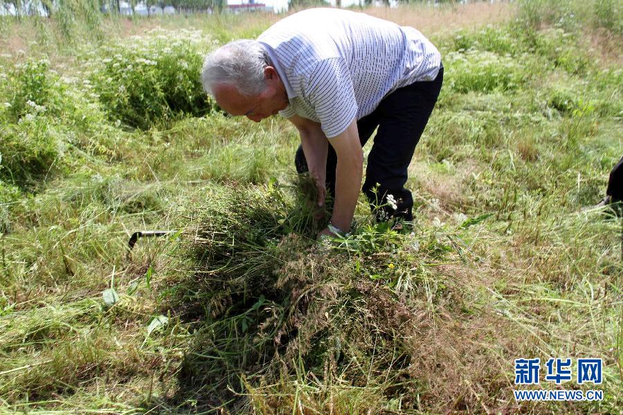 2016年8月1日,在黑龍江省齊齊哈爾市拜泉縣城西濕地,王樹清在幫養(yǎng)畜戶打飼草、捆草。新華社發(fā)