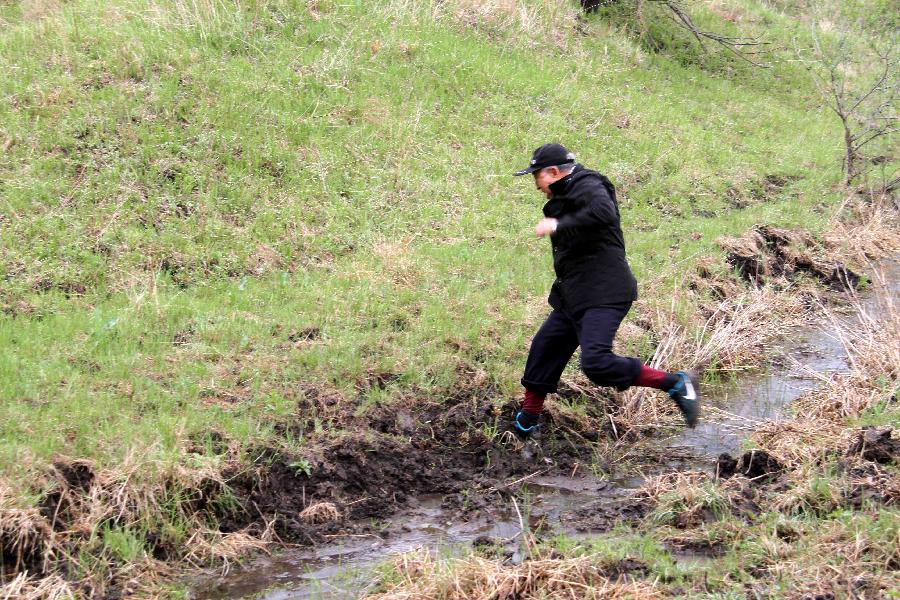 2016年5月25日,王樹清在黑龍江省拜泉縣國富鎮(zhèn)愛護(hù)村查看造林地塊時(shí)跳過一條水溝。新華社發(fā)
