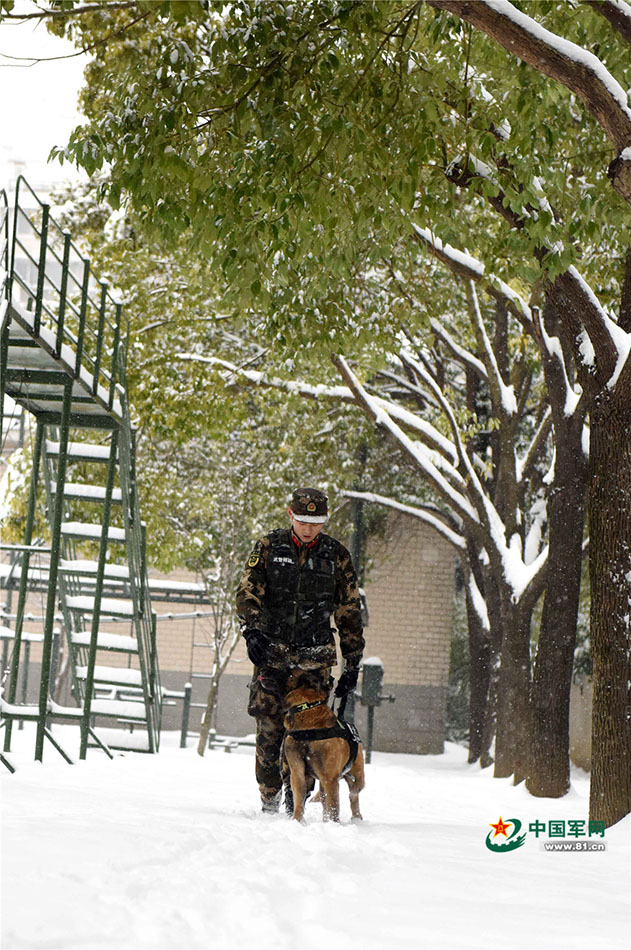 1月27日,武警安徽總隊機動支隊警犬班班長王營廣與警犬“魯克”互動交流,增進情感。