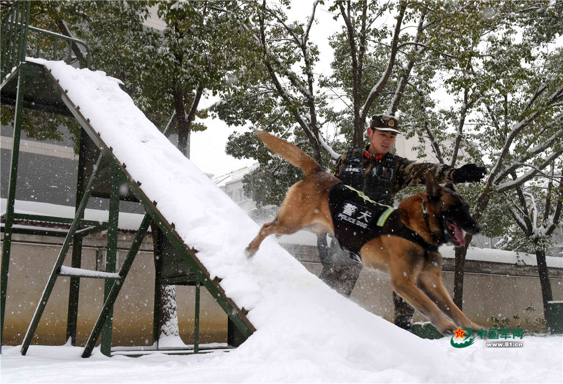 1月27日,武警安徽總隊機(jī)動支隊警犬班班長王營廣帶領(lǐng)警犬“魯克”通過障礙。