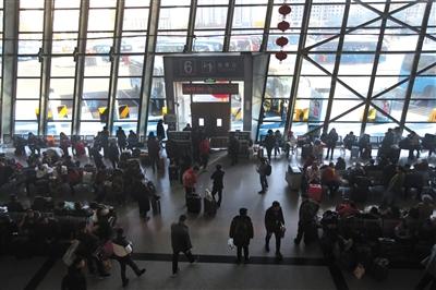 2月3日,北京六里橋長(zhǎng)途客運(yùn)站春運(yùn)客流增多,圖為檢票大廳等待乘車的旅客。