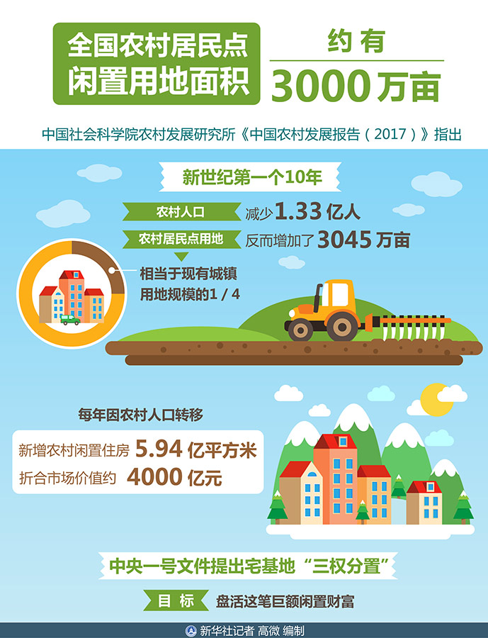這是全國農(nóng)村居民點閑置用地大致面積。中國社會科學(xué)院農(nóng)村發(fā)展研究所《中國農(nóng)村發(fā)展報告(2017)》指出,新世紀(jì)第一個10年,農(nóng)村人口減少1.33億人,農(nóng)村居民點用地反而增加了3045萬畝,相當(dāng)于現(xiàn)有城鎮(zhèn)用地規(guī)模的1/4。每年因農(nóng)村人口轉(zhuǎn)移,新增農(nóng)村閑置住房5.94億平方米,折合市場價值約4000億元。