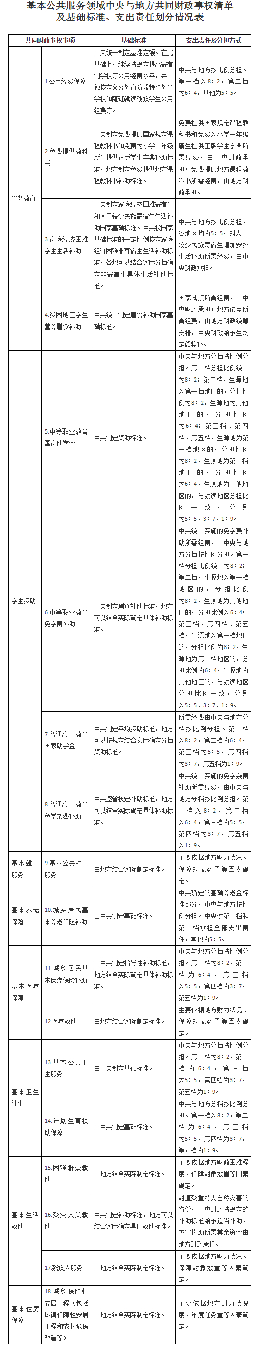 附:基本公共服務(wù)領(lǐng)域中央與地方共同財(cái)政事權(quán)清單及基礎(chǔ)標(biāo)準(zhǔn)、支出責(zé)任劃分情況表。來自中國政府網(wǎng)