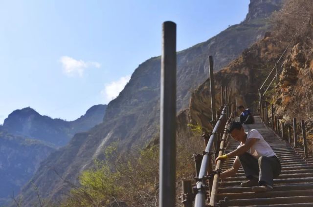2017年4月13日,工人在加固通往涼山彝族自治州阿土列爾村的鋼梯。新華社記者 劉坤 攝